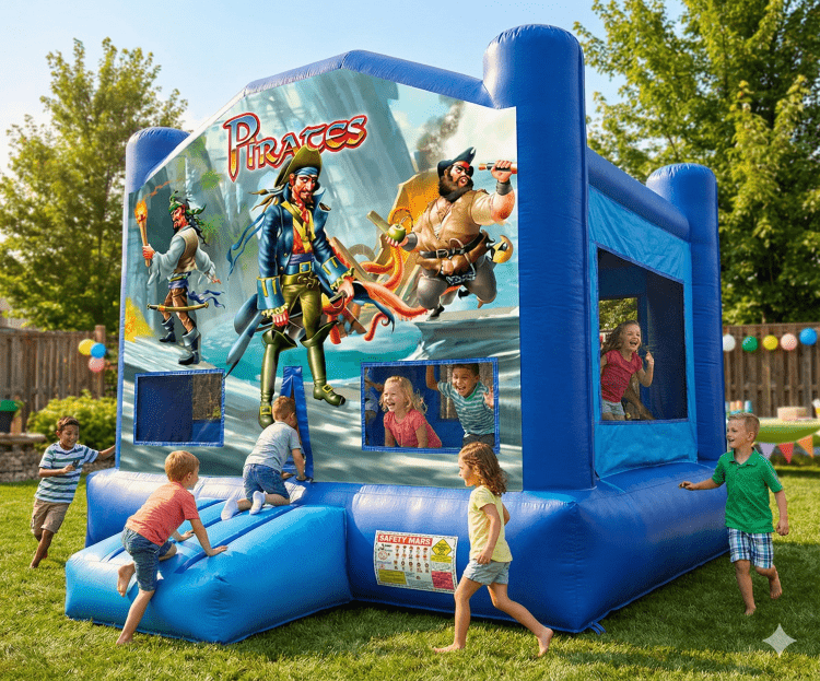 Turn your party into a swashbuckling seaside adventure with our Pirates of the Caribbean Bounce House, a bold, ocean-themed inflatable perfect for events across Staten Island, Brooklyn, Queens, Manhattan, the Bronx, and NJ. Featuring vivid pirate artwork and a bright nautical design, this bounce house instantly becomes the centerpiece of any celebration. The spacious jumping area gives kids plenty of room to bounce and play, while mesh safety windows allow adults to supervise easily from all sides.